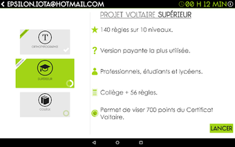 Orthographe Projet Voltaire est disponible pour Android 9.0 ou plus, la version actuelle du logiciel est 10.0.2, et vous pouvez l'exécuter en anglais, allemand et français.